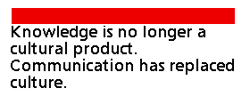 The overall picture is clear. Whereas in the past information used to be a prerequisite for knowledge and the acquisition of knowledge gave you time to think, nowadays information equals knowledge. Seeing the invasion in Somalia live means knowing about it (not understanding it); the possibility of handling millions of databases (not using them usefully) equals knowledge. Hence, knowledge is no longer a cultural product. Communication has replaced culture. That is why those who watch a lot of television never have the impression that they are wasting their time. After all, they are communicating and that is supposed to be a cultural occupation.