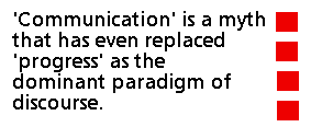 This new discourse may be explained by the end of the Cold War, when the traditional clash of ideas ceased to exist and capitalism went looking for new founding myths ('idées moteurs') in order to continue mobilising society around its ideological programme. 'Communication' seems to be one of these myths and has even replaced 'progress' as the dominant paradigm of capitalist discourse.