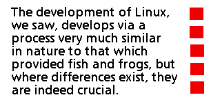 Evolution certainly goes far to place Raymond's astonishment at Linux with what evolutionists felt for the eye. For Raymond, evolution is more than a convenient analogy for the improbable development of Linux. In his rhetoric, one is to note an assuring tone that Raymond is referring to evolution in its true sense and form. And indeed, there has been a legitimate claim, with which I am sympathetic, that evolution is not only a biological phenomenon, but more generally, a law of probability that applies broadly to changes in non-biological populations as well. And yet, relatively little is understood about the mechanisms of non-biological evolution. Is it indeed more than an analogy? Can we safely apply the concepts of organic evolution to Linux? How does non-biological evolution differ from biological evolution? And ultimately, how does evolution, with its random and blind forces, create something as complex and yet powerful as Linux? Regarding how much light evolutionary theory has cast over the hidden alleys of life science, these questions seem worth considering further than Raymond has. I feel, indeed, that there is much more to be said and learned about the Linux project as well as the basic nature of cultural epistemology by considering the issues more critically in the light of evolutionary theory. Moreover, to the extent that the theory of biological evolution has provided a conceptual framework for the development of organic life at all levels, from the unicellular architecture to the largest ecosystems, I suspect that a theory of cultural evolution will help us develop an equally broad and diverse perspective on the emergence of knowledge, from the "microscopic" level of the source code to the macro world of the Linux community as a distinct cultural group in the larger society. To this end, we will consider the fundamental concepts of evolution as the theoretical basis for evaluating the Linux project. In particular, we will examine the theory of mimetics, which has been gaining attention in certain segments of the scientific community as a promising application of ideas from genetics to cultural evolution. Memetics seems to promise a rich framework for our analysis as well.