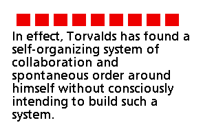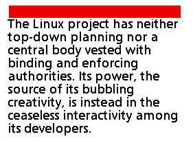 Second, the size of the Linux project is simply unprecedented in the history of software development. At times, thousands of programmers have volunteered their time and effort in the daily development of numerous components and functions that comprise the operating system. According to one estimate, the project has involved over 40,000 people worldwide [ 8]. Needless to say, none of these volunteers are financially compensated for their contribution. Nonetheless, the Linux project has grown to its immense size without formal organization around central authority. Fred Brooks, an authority on software engineering, has found that, due exactly to rising costs of coordination, production time increases exponentially with the number of developers [ 9]. In the corporate world, the Brooks' Law has more or less become a truism. In the case of Linux, however, there has never existed centralized organization to mediate communication between Torvalds and the thousands of contributors, nor are there project teams with prescribed tasks and responsibilities, to which individual contributors are specifically assigned. Instead, from the beginning, it has been left to each person to decide what to work on at the moment, even at the potential risk of coordination difficulties. And yet, for all that, the Linux project has proceeded at a remarkable speed, with updates and version releases on a daily and weekly basis at times. For comparison, let us consider the fact that Linux was conceived five years after Microsoft began the development of Windows NT [ 10]. But already, Linux is considered a competitive alternative to NT. Here, then, the relation between the eye and Linux is one of contrast rather than strict analogy: whereas the eye evolved slowly and gradually over millions of years, Linux developed at an exceptional speed, even by the standards of today's technology. In this light, it is all the more remarkable that the Linux project succeeded as well as it did.