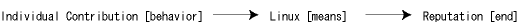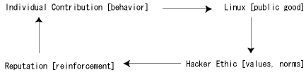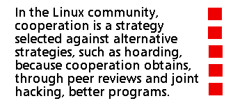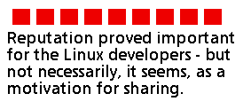 As for the co-developers, the development of the kernel essentially amounts to a competitive process, in which they each seek to contribute the best code they can. Although none of them are financially compensated, Raymond argues that they derive enough satisfaction from the reputation their effort and skill earn from each other [ 16]. In effect, ego satisfaction through reputation becomes directly tied to the self-interest of the individual hackers that in turn drives the Linux project.
