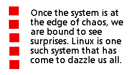 So far I have used the term "complex" rather casually in describing Linux, only to stress its seemingly implausible development. On the one hand, this might very well suffice, for most of us have an intuitive feeling of what complex implies. It might indeed be futile to try to define complexity in formal terms, for the nature of complexity depends broadly upon one's perspective. On the other hand, however, complexity has a pivotal significance to our understanding of Linux as an evolutionary system inasmuch as evolution is directly concerned with complexity. Evolutionist Richard Dawkins goes so far as to claim that, whereas physics is a science of analytical simplicity, of "ultimate origins and ultimate natural laws," biology is a science of [real-world] complexity [ 32]. On this ground, it would be useful to capture more clearly what is meant by complexity and what makes complexity so special - not so much as to determine for ourselves how complex Linux is, but rather, to bring our attention closer to the common principles of complexity and step beyond an intuitive understanding of Linux as a complex system.