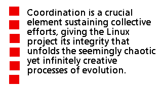 The second issue concerns coordination: How do contributors coordinate their efforts without rigorous planning under centralized authority? The importance of coordination cannot be stressed enough. On the one hand, people can be motivated and still fail to orchestrate their efforts effectively. On the other hand, coordination is also critical to explaining the quality of Linux in the very sense that quality, as we discussed earlier, is an emergent property of coordinated efforts. Coordination is hence a crucial element sustaining collective efforts, giving the Linux project its integrity that unfolds the seemingly chaotic yet infinitely creative processes of evolution. In particular, the issue of coordination highlights an important and intriguing aspect of evolution generally overlooked: self-organization.