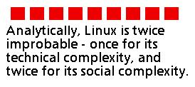 In short, our interest in the evolution of Linux is two-fold. For one, we must appreciate the sheer complexity of the operating system on its own terms. To the extent that the performance of an operating system is a close function of tightly integrated components, a seemingly innocuous bug (a digital butterfly, if you will) in a single line of code might trigger a storm elsewhere unexpected and not easily traceable. At the same time, this logical and densely interconnected design of the operating system is to be sharply contrasted with the shapeless contours of the growing development community. In particular, we must understand the serious implications the decentralized structure of the community pose for the issues of motivation and coordination among developers. How do Linux developers manage to build a coherent operating system when nobody in particular is in charge? Analytically, Linux is therefore twice improbable - once for its technical complexity, and twice for its social complexity.