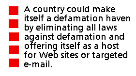 So far, there are no countries that have advertised themselves as defamation havens. However, there is an alternative that can be just as effective: getting a number of people around the world to put the material on their Web sites in the cause of free speech. In principle, each ISP and Web host could be sued. But this is pretty unlikely, given the costs of mounting cases in foreign jurisdictions. Furthermore, defamation laws vary from country to country, and sometimes between provinces within countries, so the attempt to shut down all the sites internationally may have little prospect of success compared to achieving this in single jurisdiction with harsh legislation.