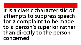 If officials at the University of Adelaide had approached me directly with information about the Pinnock case, for example to argue that some statements in the documents were false or requesting that I post a reply, that would have been a process of dialogue and debate. However, their approach was to try to stop publication. It is a classic characteristic of attempts to suppress speech for a complaint to be made to a person's superior rather than directly to the person concerned.