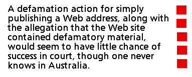 A defamation action for simply publishing a Web address, along with the allegation that the Web site contained defamatory material, would seem to have little chance of success in court, though one never knows in Australia. Nevertheless, UWA's threat apparently inhibited mass media outlets from further publication of the address.