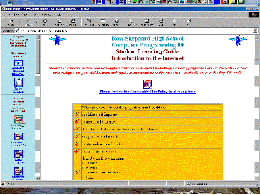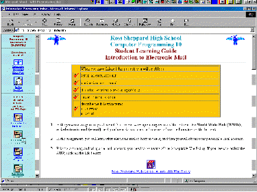 The use of Web-Based Instruction creates a classroom that looks and operates much differently than many traditional classrooms. Physically, the space is the same, or can be, although a Web-based classroom probably has a higher number of computers available for student use. The real difference lies in the way in which the students learn and the teacher teaches. In fact, very little "teaching" goes on in a Web-based classroom, at least in the whole-group sense, but much "learning" occurs. The Web-based classroom described here is used in-class instruction and is not intended to be distance education, although it could be used for that purpose. The most important thing to remember about a Web-based classroom is that the locus of control changes; a Web-based classroom is no longer focused on the teacher, but rather, it is very much learner-centric. This is a risky type of strategy if the teacher is not able to relinquish some control. It also dictates a responsibility change - from the teacher to the learner. While it is student centered, there is still much work to be done by teacher, teaching skills such as time management with students, planning, and organization. There is intense small group and one-on-one work done by the teacher with the students. Web-based instruction allows for students to progress at a pace they feel comfortable with - within certain constraints of the course such as progress deadlines. This type of instruction also allows teacher some more freedom - assessment is often done on the spot with the student, for example. As McCormack and Jones (1998) suggest, "the trend in Web-based classrooms is away from the student as a passive recipient of knowledge toward the student involved in the learning process as an active, self-directed participant. Both educators and students with experience on of traditional didactic methods may have problems adapting to this new approach" (p. 23). A Web-based classroom is a very active classroom, and students quickly become spread out over a variety of projects.