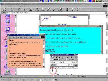 Figure 2: Color coding Web site modules. The top window is the pop-up glossary, the second window is a self-quiz window, and the large window in the background is instructional window from which the other two are linked.When designing instructional Web pages, the issue of whether or not to use frames often arises. Frames are used to split a Web page into multiple windows. This design decision affects earlier versions of browsers, because not all could properly display sites utilizing frames. However, most users now have frames capable browsers, so this technical issue should no longer be a concern. Nevertheless, the instructional issues remain valid. Frames should be used to enhance a Web page and make it easier for the learner to use or navigate the site. A frames-based implementation assures the learner will always have the navigation panel available and be able to navigate the site. Figure 3 below shows a Web site that makes use of frames. The left frame contains navigation aids and project titles, while the right frame contains the instructional material related to the project the student is working on.