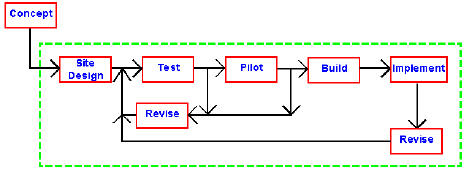 Once the Web site has been conceptualized, a test of the design of the Web site must be made. This usually encompasses one or more possible page layouts, graphic styles, backgrounds, text color, and so on. It is a good idea at this stage to have the learner audience look at the test designs and provide some feedback. Once you have decided on a basic layout, it should be piloted with a group of learners that will approximate the group that will be using the Web site. Because Web-Based Instruction takes some time to develop, the test group may not be the same as the implementation group. During and after the pilot phase of the development, the Web pages should be reviewed and revised as necessary.