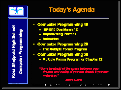 Figure 6: A daily agenda prepared in PowerPoint is displayed each class.As Briggs, Gustafson, and Tillman (1991) state, "in mastery learning environments - where time is allowed to vary - studies have shown most students can achieve the objectives" (p. 4).