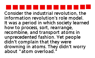 Consider, for example, the industrial revolution, the information revolution's role model. It was a period in which society learned how to process, sort, rearrange, recombine, and transport atoms in unprecedented fashion. Yet people didn't complain that they were drowning in atoms. They didn't worry about "atom overload." Because, of course, while the world may be composed of atoms, people don't perceive it that way. They perceive it as buses and books and tables and chairs, buildings and coffee mugs, laptops and cell phones, and so forth. Similarly, while information may come to us in quadrillions of bits, we don't consider it that way. The information reflected in bits comes to us, for example, as stories, documents, diagrams, pictures, or narratives, as knowledge and meaning, and in communities, organizations, and institutions. [ 8]
