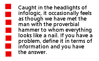 Overreliance on information leads to what we think of as "6-D vision." Unfortunately, this is not necessarily twice as good as the ordinary 3-D kind. Indeed, in many cases it is not as good, relying as it does on a one-dimensional, infocentric view.