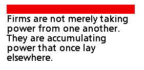 Finally, firms are not merely taking power from one another. They are accumulating power that once lay elsewhere. The political scientist Saskia Sassen traces the decline of the nation-state not to the sweeping effects of demassification and disaggregation, but to the rise of powerful, concentrated transnational corporations. The new economic citizen of the world, in her view, is not the individual in the global village but the transnational corporation, often so formidable that it has "power over individual governments." [ 31] The state and the firm, then, are not falling together along a single trajectory. At least in some areas, one is rising at the other's expense.