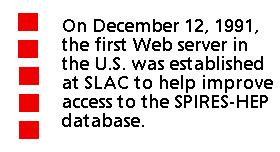 LA: On December 12, 1991, the first Web server in the U.S. was established at SLAC to help improve access to the SPIRES-HEP database. For a number of years, SLAC had been providing remote access to the SPIRES-HEP database. In fact, by the time we launched our first Web server, the SPIRES-HEP database had nearly 5,000 registered users in 40 countries.