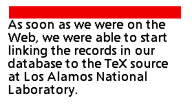 And as soon as we were on the Web, we were able to start linking the records in our database to the TeX source at Los Alamos National Laboratory ( LANL) where, in August 1991, Paul Ginsparg had started the first e-print server. Paul, by the way, almost single-handedly made another kind of revolution in the way scientific literature is handled ... but that's a whole other story.