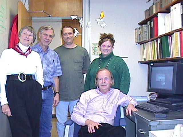 The original WWW Wizards at SLAC visit Paul Kunz. Left to right: Louise Addis, George Crane, Tony Johnson, Joan Winters, Paul Kunz, and a NeXt computer (missing: Bebo White and Mark Barnett). Photograph courtesy of the Stanford Linear Accelerator Center, Archives & History Office, Stanford, Calif.