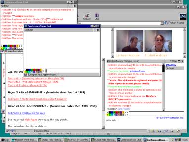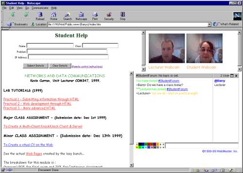 Basically, all the lab tutorial notes for the networks module are stored in the /com347/ directory. The students have been given this Web page address at the start of term and told to work from these notes for the semester. They are introduced to the Web cam and chat board in the first session. They are encouraged to use the facilities when problems arise. The lecturer must be logged on too during the session for the full service to be in operation. This basically involves the lecturer opening the /com347/index.htm page, the same html page that the students are using. We are currently in the process of evaluating the student feedback questionnaires on the service.