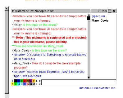 In Figure 1, we see the standard Helpmate screen where a student has logged on and the lecturer is also logged. The people logged on within the student forum are listed on the right of the chat applet. People can come or go. We see the lecturers names preceded by an '@'. This tells us that the lecturer is the forum supervisor and he holds the power to remove interlopers from the forum.