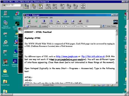 Should the lecturer have to remotely login to the student machine, he will ask the student to e-mail their IP address. Then the Verase program is executed allowing the lecturer to take control of their machine. The student can see the lecturer working on the computer. We may allow other students to invoke this feature in future versions. However, there is an obvious serious security risk involved in allowing students to take control of other computers. Figure 3 illustrates the view from a lecturer's computer of a remote student Web page and MS-DOS window. The lecturer is free, for example, to investigate and change class path settings to enable the student to compile the Java program.