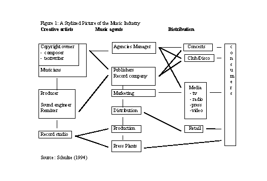 Currently technological developments and a liberal, free market ideology are working together to create a global economic sphere. In this paper I will concentrate on the effects of developments in information and communication technology (ICT) on the music industry. Studies in technology dynamics indicate that social actors can and often do steer technological developments, or mediate its effects [ 6]. One important arena where parties try to mediate or minimize the effects of ICT on the music industry is the World International Property Organization or WIPO in Geneva. Vested interests represented in WIPO, and lobbying at the EU, in the U.S. Congress, and the World Trade Organization (WTO) try to ensure that the system of copyrights - that is of fundamental importance for the way in which the industry is presently structured - will not alter profoundly. In terms of the 'speculative economics' argued for by DeLong and Froomkin [ 7] most recently and others, these attempts can be interpreted as efforts to maintain excludability and rivalry in the consumption of music products. Negotiations about the exact form and scope that copyrights should have for the Internet will directly affect the distribution of income between different parties in the music industry [8].