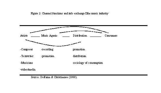 It is, therefore, likely that intermediaries will continue be active in the music industry; see Figure 2. Furthermore, it is likely that historical intermediaries will continue to remain important. Record companies and music publishers have been able to adapt to changes in their economic and technological environments in the past, thanks to their finanical strength and collective reputations. The broken line in Figure 2 indicates that different intermediaries, new and old, will increasingly competing with one another. For example,Rolling Stone magazine is already taking on the role of record companies by selecting and distributing music. Competition from outside the value chain - as it has emerged over the past - is also likely.