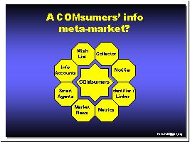 At Amazon, consumer book reviews are provided free, increasing Amazon's asset value. For this service, Amazon reviewers get nothing (but I'm sure it will soon change). Now suppose Barnes and Noble offered equity in exchange for ongoing reviews and favorable customer feedback. How long would it take for reviewers to migrate their reviews to Barnes and Noble? How quickly would their loyalty change?Even now, COMsumers are accumulating transaction information, changing their behavior by searching the Web for new functionalities and listing their preferences for future purchases. The age of community owned information assets and info-exchanges for info-funds is just around the corner! Perhaps the main chance for a return to stability from the present dotcom-driven hyper competitive land grab is for organizations to sponsor sustainable COMsuming communities.