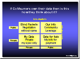 First lets look at a product where there is a big savings potential. Let us take a new car purchase. Imagine for a moment there are 15,000 people that have registered their commitment to buy a new Toyota Camry this month but all have a second choice or a no buy if the deal isn't good enough. www.priceline.com with a consumer aggregation engine would provide a good example of how this might be done. The manufacturer now decides how many they will make and sell based on the lowest price at different demand levels. Then those lucky buyers (10,000?) now all know each other so they can freely start to aggregate everything from insurance, to service, cleaning, and gas purchasing. The first contact effectively floats the potential for a new information market and an ongoing relationship between these consumers. How much would these consumers need to spend to float such an info-market? How many might participate? Should they own it? How much might the data be worth over the life of these purchases? What's their worth to future purchases or leverage?III: Empowered COMsumers Participate in Personal Information Markets