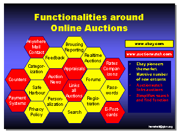 As we know, the Web is continuously developing and generating new functionality for users. As noted earlier, the functionality that www.ebay.com first provided filled a certain niche as the first online auction site. However, on the Web the benefits of that original space are quickly modified, added to, and re-presented by competitors who recombine the original elements in new ways. Thus www.auctionwatch.com further developed the functionalities of this emerging market. The various red hexagons in the illustration above represent market space www.ebay.com could have captured. Since it did not, E-Bay's long term potential may be at risk if the COMsumers decide this or other new benefits packages are more attractive. Note: as this is written Yahoo and Ebay are involved in merger talks.
