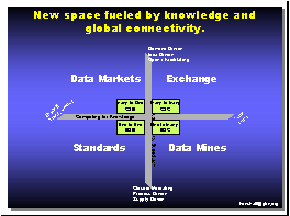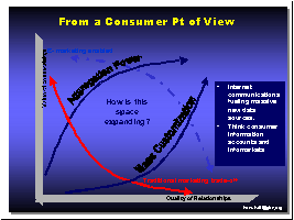 Note: A recent McKinsey & Co. study found Internet companies are spending more on customer acquisition than they're likely to make in profit from a typical customer. Most sites have a hard time getting people to come back.Traditionally firms held the key relationship in financial markets. In the virtual 'demand driven' world individual information may hold the key to markets. In this new economy, organizations learn that investing in the creation and management of data markets and exchanges is more valuable than closed retention of standards and data mines. This means organizations may lose or be forced to share their most valuable asset - the customers' data record - with them. How firms manage and profit from these transactions will be the key to surviving in the new e-economy.
