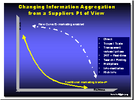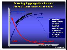 From the Consumer point of view we can redefine the axes. E&W take a Industrial Economy view supply driven. Ie Reach and Richness. Here I have re-defined the axes in consumer terms. Reach becomes the value of connecting or connectivity, while richness is re-stated as the Quality of the relationships as trust and permission increase with personalization. Aggregators encourage the development and payment for goods and services by function by navigating the new value network. The power of Aggregators grows as they build potential for broader network aggregation. At first they provide a simple one to many functionality (e.g. www.dealtime.com). As these aggregators evolve they will change the power structure from "one to many" (i.e. one supplier to many customers) to a "many to one" model where a value creating network is formed to satisfy individual or group demand. Over time the simple accumulation of more detailed information by consumers will provide additional opportunities for community aggregation; see also [ 6]. The curve follows a trajectory that starts with individual use of aggregators (the cost savings will drive their use) and then extends as consumer participation and data sharing enables new consumer relationships to be established that gain additional/group leverage.