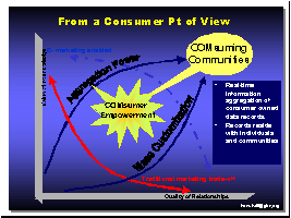 Information is key to customer retention and loyalty. Customers are slowly beginning to understand the value of their information. The increase in organizations like www.netcentives.com, www.cybergold.com, and www.freeride.com are examples of how consumers are being paid by new data aggregators to get additional leverage.- Consumer Directed Aggregation Communities: