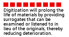 In addition to the descriptive metadata for the Collection and its contents encoded in EAD and MARC, we also have a great deal of data that is often referred to as administrative metadata. This metadata relates to the digital objects themselves and the process by which they were created rather than the intellectual content of the objects. For images, this information includes things such as resolution, file format, colorspace, gamma, scanning hardware and software used, corrections applied in the scanning software, etc. For sound files, it includes sample rate, sample size, number of channels, compression, etc. Some of this information is actually represented in the image and sound files themselves, while other pieces have been recorded in spreadsheets by digitizing technicians. The questions related to what data elements we will retain permanently as administrative metadata and where we will store this metadata are important ones. This information may be of use in the future for purposes of digital format migration or determining the accuracy of the digital reproductions (particularly if the original items are lost or destroyed). For images, we plan to examine some of the recent work in this area [ 1] [ 14] [ 15] and make the best possible determination on what to retain until true standards emerge. There is less existing work on administrative metadata for music sound recordings than for other formats, so we may simply have to use our judgement in this area to determine the best course of action.