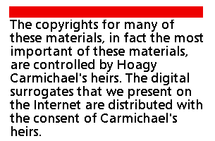 The vast majority of the materials in the IU Hoagy Carmichael Collections are covered by copyright. The copyrights for many of these materials, in fact the most important of these materials, are controlled by Hoagy Carmichael's heirs. The digital surrogates that we present on the Internet are distributed with the consent of Carmichael's heirs. Although preservation exemptions and fair use provisions of the copyright law might have allowed digitization of these collections without permission, we need permission of the copyright holders to distribute them in any way. Throughout the years since the collection came to Indiana University following Carmichael's death in 1981, Indiana University, in general, and the Archives of Traditional Music, specifically, have benefited from a positive working relationship with Hoagy Bix Carmichael, Hoagy's oldest son. Early in the Project planning stage, the Director of the Archives of Traditional Music contacted Mr. Carmichael about the Project and received his verbal agreement to make accessible on the Web everything for which the family holds the copyright. We proceeded with the understanding that this verbal agreement would eventually be formalized in writing.