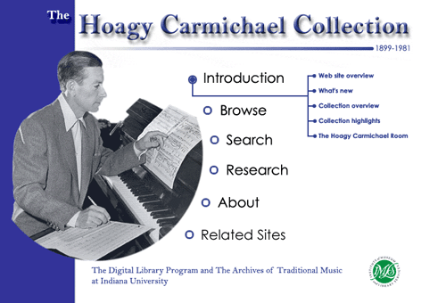 Figure 1: Hoagy Carmichael Collection home pageIndiana University selected the Hoagy Carmichael collections for a digital project for a number of reasons. The first is the continuing undeniable appeal of Carmichael's music. Scholars believe that Carmichael offered unique contributions within the context of twentieth-century popular American music history. His songs were experimental and innovative, reflecting his interest in jazz, folk, and other vernacular American musics. And yet, despite the broad range of his influences and the sophistication of his songs, Carmichael's music remained accessible. A "musical democrat," Carmichael created songs that "communicated with Park Avenue society and Wall Street brokers as well as with small-town merchants and tenant farmers" [ 4]. Second, the timing of the Project was also important. The year 1999 marked the Centennial of Carmichael's birth, which focused increased attention on his life and work. Third, Carmichael had ties to both Indiana University and to Bloomington, where the University is located. Carmichael grew up in Bloomington and graduated from the IU School of Law in 1926. He composed his enduring pop standard "Star Dust" in Bloomington, and the story of its creation has become an integral part of local history. Fourth, IU's Archives of Traditional Music offers the largest grouping of materials pertaining to Carmichael's life available anywhere. Carmichael valued his association with the community and University, and as a result, he and his heirs have contributed to Indiana University many materials pertaining to Carmichael's career. Complementing this collection are Carmichael's manuscripts and sheet music at the Lilly Library, IU's principal special collections repository, as well as miscellaneous materials at the IU Archives.