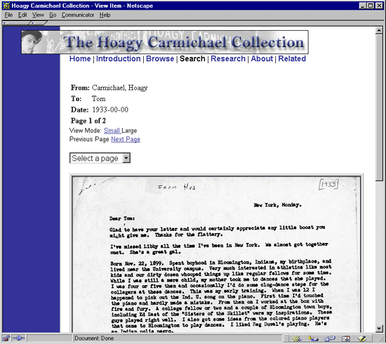 In the case of the correspondence items in the Carmichael Collection, we felt it would be beneficial to have both images and encoded text versions available, so that users could search for words and phrases to find letters that refer to particular individuals, songs, etc. In most of our past projects dealing with large bodies of text, we have relied on high-performance OCR software to transform page images into editable and searchable text. In the case of the Hoagy Carmichael correspondence, much of it was handwritten and/or of such a quality that it could not be accurately recognized by the OCR software. So in this case, we used hourly student employees to transcribe the documents by hand. The body of text was small enough (222 items) that this was a manageable task. The documents were then encoded using the TEI (Text Encoding Initiative) SGML DTD (document type definition). With the text transcribed and encoded, we implemented search capabilities using OpenText's SGML-aware search engine in combination with Perl scripts and modules originally developed at the University of Michigan [ 17].