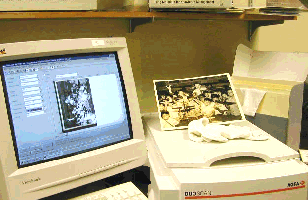 Because the only cataloging done for the vast majority of material in HWRD occurred in the late 1940s as the items came to HWRD and did not meet library standards even for the 1940s, the scanning project automatically required us to create metadata records of each item scanned to accompany the images. The IMLS grant included funding for participation in a metadata workshop sponsored by OCLC in Dublin, Ohio. Along with other participants in the workshop, we created a template of fields from the Dublin Core for metadata on each item. We chose to use the title field twice, unqualified to handle the description of the photographic print as written either on the reverse of the print or attached to it, and the "alternative" title field to cover the caption accompanying published images in the newspaper. Likewise, we chose four potential date fields for each photograph. Most images will only need two of them. Occasionally, however, a photograph will date from one day, depicting the events of another day, be published in the newspaper on a third day, and be scanned on a fourth day. Since researchers may need these dates distinguished, we decided to have the option for all four dates.