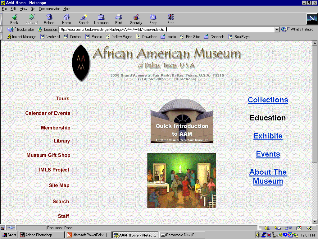 Figure 1: Test Web site for the African American MuseumThe third and final goal of the Project is to produce a model for how academic and museum institutions may collaborate to support and maintain digital imaging laboratories. Data collection to support this goal include direct and indirect costs associated with the support and maintenance of digitizing laboratories as well as identifying the skills and knowledge are