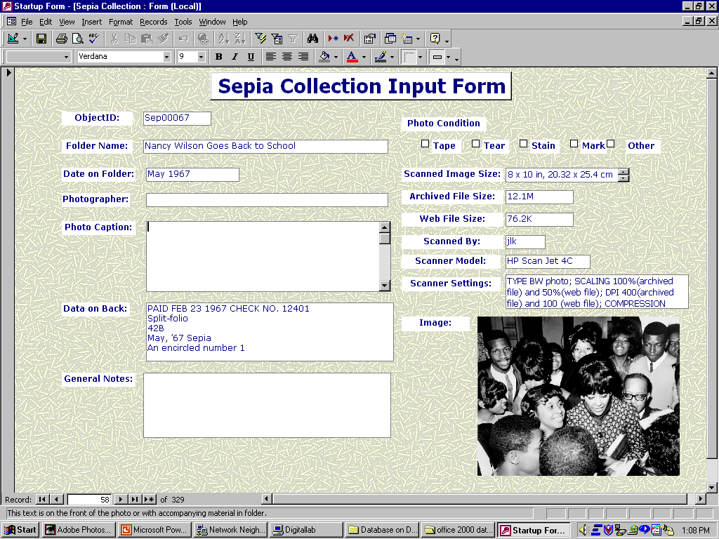 Figure 2: Database for Image Management (Sepia Archive)needed to support and maintain a digitizing laboratory. We will be looking directly at the outcomes of providing digitizing services from the University's viewpoint in addition to investigating what benefits may result from such a partnership. Most important, we will provide a look at the experience as a whole, recording, and reporting both successes and problems before making recommendations. Miguel Arroyo Morales, a Ph.D. candidate in the Interdisciplinary Information Science program at UNT, is proposing to look at the nature of institutional collaboration as his dissertation topic.