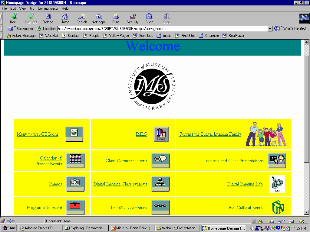 The courses required for a Certificate of Advanced Study in Digital Image Management are described in detail at http://www.unt.edu/slis It is possible to complete the CAS in Digital Image Management with a total of 24 credit hours. Each student may substitute courses with approval from the program advisor. The idea is for each student to be able to design a program that best provides the needed skills and knowledge for their level of expertise. The required, core course for the program is Digital Imaging. It may be taken for 3 to 12 credit hours. Content includes copyright issues, preservation, collection development, image capture and manipulation, Web site design, and database construction. The digital imaging course is supported by WebCT software. The software provides forums, chat, e-mail, presentation boards, etc. Figure 3 shows how the course is currently arranged in the WebCT interface.