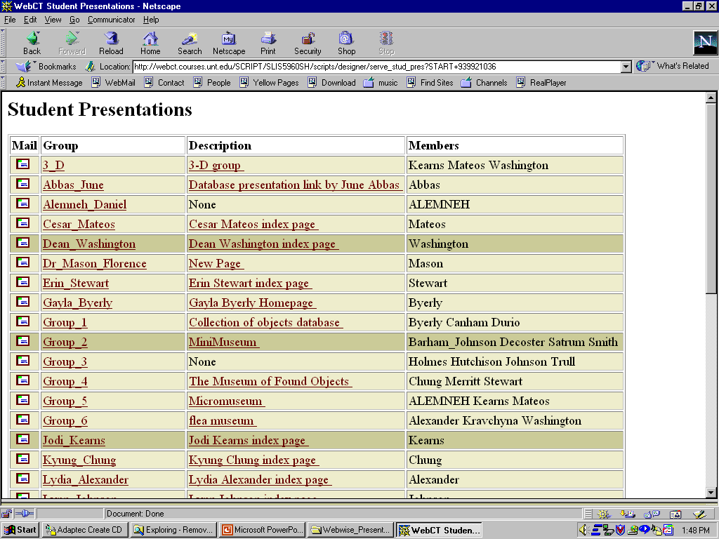 Figure 3: WebCT Software Supports Digital Imaging CourseThe students work in teams to research, design and implement various tasks and activities reflected in the Project work plan. Figure 4 gives an example of the types of team reports that have been presented during the last semester.
