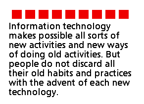 These are exciting times. Information technologies are increasing in speed, power, and sophistication, and they now can link together a vast array of devices into a network that spans the globe. They offer new ways of learning, working, and playing, as well as conducting global commerce. Some contend that these changes are revolutionary and will change the world; others argue that the changes are evolutionary, and that individuals and organizations will incorporate networked information technologies into their practices just as they incorporated many earlier media and technologies. In this book I take the view that these changes are neither revolutionary nor evolutionary but somewhere between: that they are co-evolutionary. New technologies are based on perceived needs and available capabilities. People adopt these new technologies if and when they deem the technologies useful and when they deem the effort and the costs appropriate. Sometimes individuals make these decisions; sometimes organizations make them. The result is that some technologies are adopted by some of the people some of the time. No matter how voluntary or involuntary the adoption process, individuals and organizations adapt technologies to their interests and practices, often in ways not anticipated by the designers of those technologies. Information technologies are more flexible and malleable to individual practices than are most other innovations, and this makes them especially adaptable. They also evolve more quickly than most other innovations, with new and improved versions appearing at a dizzying rate.