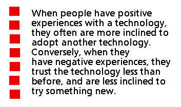 Conversely, late adopters of one technology tend to be late adopters of others. These people are far less likely to appreciate technology for its own sake, preferring mature, easy-to-use technologies with a high perceived payoff relative to the effort required in learning to use them. They are happy to let others "work the bugs out" before spending the time, effort, and money to adopt them. This distinction between the personality characteristics and social context of early and late adopters is an important one to bear in mind when considering technologies intended for a mass market. If a global information infrastructure is to achieve wide acceptance, it must be attractive to late adopters.