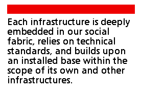 It is both engine and barrier for change; both customizable and rigid; both inside and outside organizational practices. It is product and process. ... With the rise of decentralized technologies used across wide geographical distance, both the need for common standards and the need for situated, tailorable and flexible technologies grow stronger.Star and Ruhleder are among the first to describe infrastructure as a social and technical construct. Their eight dimensions [ 4] can be paraphrased as follows: An infrastructure is embedded in other structures, social arrangements, and technologies. It is transparent, in that it invisibly supports tasks. Its reach or scope may be spatial or temporal, in that it reaches beyond a single event or a single site of practice. Infrastructure is learned as part of membership of an organization or group. It is linked with conventions of practice ofday-to-day work. Infrastructure is the embodiment of standards, so that other tools and infrastructures can interconnect in a standardized way. It builds upon an installed base, inheriting both strengths and limitations from that base. And infrastructure becomes visible upon breakdown, in that we are most aware of it when it fails to work - when the server is down, the electrical power grid fails, or the highway bridge collapses.