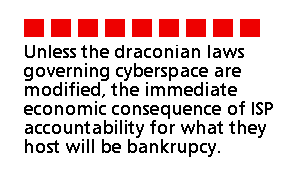 As Arno argues, unless the draconian laws governing cyberspace are modified, the immediate economic consequence of ISP accountability for what they host will be bankrupcy. By extension, all ISPs will, he believes, gradually disappear from France: