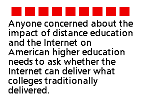 Anyone concerned about the impact of distance education and the Internet on American higher education needs to ask whether the Internet can deliver what colleges traditionally delivered. Concentrating on course work makes it seem that the only purpose of higher education is to teach a number of distinct skills and pass on discrete bodies of information. If these goals could be achieved using an alternative that is more cost effective and efficient, then traditional colleges seem doomed, but college education has additional goals which were once thought to be just as important, or even more important than these. Traditional college education had a moral and civic component which was reflected in both the curriculum and the extra-curriculum -- organized activities which comprised college life outside the classroom.