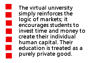 The college was a small community with a flourishing civic life. The norms of college life insisted upon participation in extracurricular activities. To decline to participate in them, to hold off from engaging in group life because one wanted to study or pursue private interests, was considered selfish [ 9]. Consider the claim that a person who goes to college and is only interested in studying and getting good grades is "selfish." In the context of the virtual university such a claim would be almost incomprehensible -- not simply wrong, but extremely puzzling. In what way is such a student selfish? In the virtual university there is a simple perfectly just exchange; the student pays money and receives a product, the online courses. To use the product effectively the student must devote time and energy to learning the material. If he or she does not, the money is wasted. The virtual university simply reinforces the logic of markets; it encourages students to invest time and money to create their individual human capital. Their education is treated as a purely private good. Students are then free to employ their human capital, the skills acquired by completing the curriculum, in whatever way they wish.