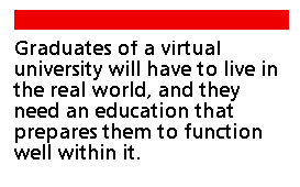 Virtual U could try to produce the experience of a virtual college community online. It could provide chat rooms for its students, but except for specific course-related discussion, why should a student spend time there with other students enrolled at Virtual U rather than participating in any of countless of discussions continually on the Net? After all, the whole world awaits to interact with them. More important, who would really want to devote their free time to helping good old Virtual U? Would the experience of taking online courses there be sufficient to create a desire to attend an online class reunion after 10 years? What is a class in this sense anyway?