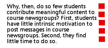 In short, if we judge course newsgroups be the criterion of posting fecundity, success is the exception, failure is the rule. It is possible, of course, to argue that this criterion is too harsh or narrow. Perhaps a high proportion of students were avidly reading the postings on their course newsgroups even though they did not contribute more. Yet our studies show that the high proportion of students who described course newsgroup postings as boring, suggesting that few students would continue to follow such discussions as the course went on. Perhaps students were engaging in dialogue with instructors or with each other using e-mail, thus accomplishing a major purpose of newsgroups in a more private forum. Student-to-student e-mail is private and cannot be collected for analysis. But the authors' collected e-mail messages from students strongly suggest that it is almost never used as an educational medium.