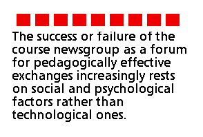 In sum, the results of our studies add to the growing corpus of literature suggesting that, as the technological and logistic problems of Internet access are solved, the more difficult social and organizational problems of communication become more evident. The success or failure of the course newsgroup as a forum for pedagogically effective exchanges increasingly rests on social and psychological factors rather than technological ones. In order to develop course newsgroups for effective pedagogical ends, university administrators must find the means to motivate their instructors, instructors must find the means to motivate their students, and everyone must find the time to make course newsgroups work. Until then, course newsgroups will remain time sinks (Whittaker & Sidner, 1997) and their pedagogical advantages will rarely be exploited.